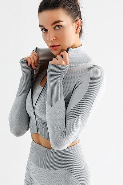 Add to your active lifestyle the experience of full comfort with our striking new complete and stylish seamless three-piece sports bra, zip front crop jacket, and leggings combo. We use a high level performance compression fabric to contour & beautifully sculpt your body. You can never go wrong with this super combo.