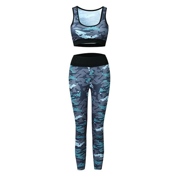 Add to your active lifestyle the experience of full comfort with our striking new complete and stylish navy camouflage two-piece sports bra and leggings combo. You can never go wrong with this super combo.