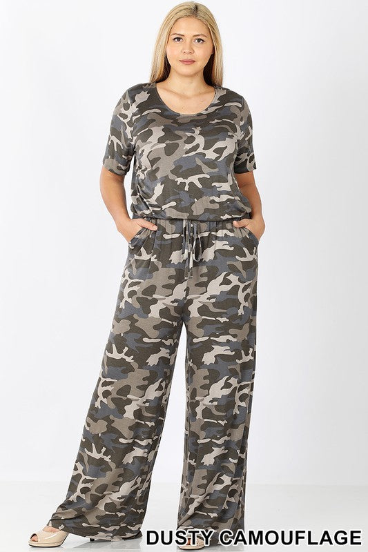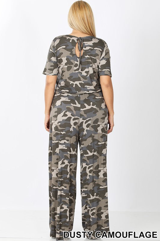 Featuring a camo print, wide neckline, and drawstring waist, this jumpsuit looks and feels AMAZING! Pair with fashion sneakers and a denim jacket for the perfect cute, casual combo. - Great comfortable fit with super soft and stretchy jersey knit 3/4 sleeves, tie front elasticized waist, Keyhole back with tie closure.
