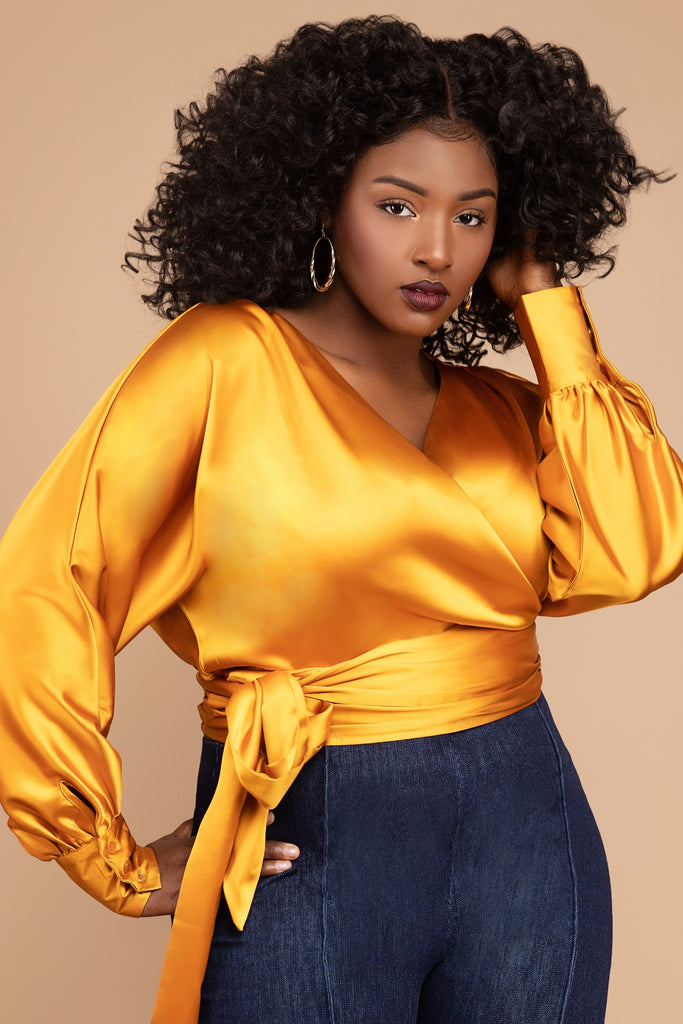 The Sophia Top is a stunning wrap style crafted from luxurious satin that drapes effortlessly for a liquid-like elegance. Featuring a flattering wrap silhouette with a sash tie at the waist and elegant bishop sleeves with buttoned cuffs, this top offers a sophisticated touch. Made from beautiful Honey Glow satin fabric, it’s perfect for elevating any look. Ideal for chic evenings or special occasions, the Sophia Top adds timeless elegance to your wardrobe.