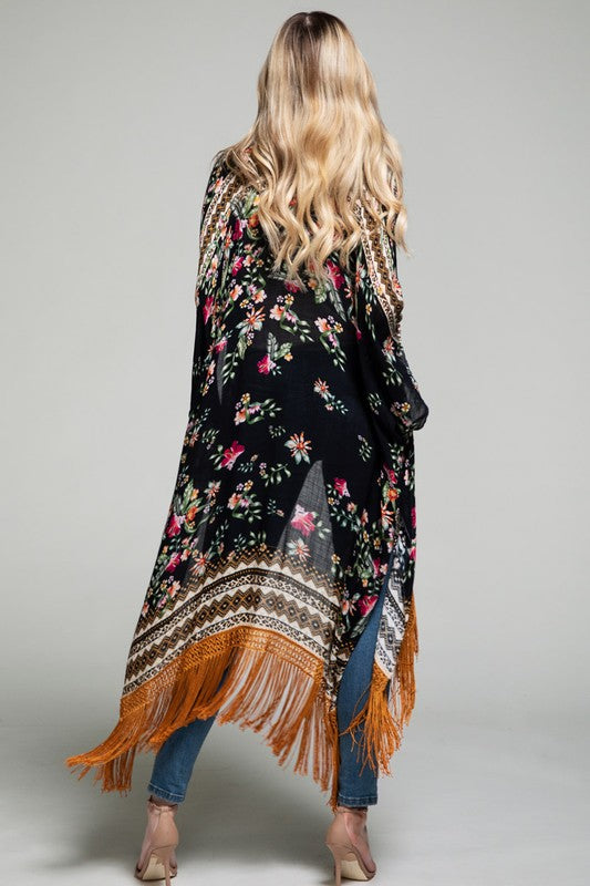 Our stunning floral print with ethnic border kimono featuring fine tassel with side slits kimono is an easy way to add feminine elegance to an outfit, with intricate tassel and side slits . It looks just as stunning paired with jeans and booties as it does with dress pants and heels.