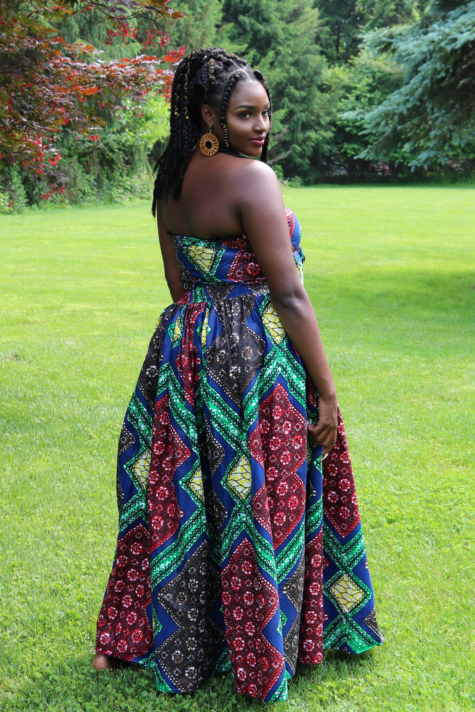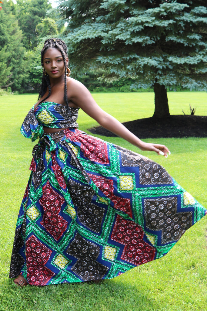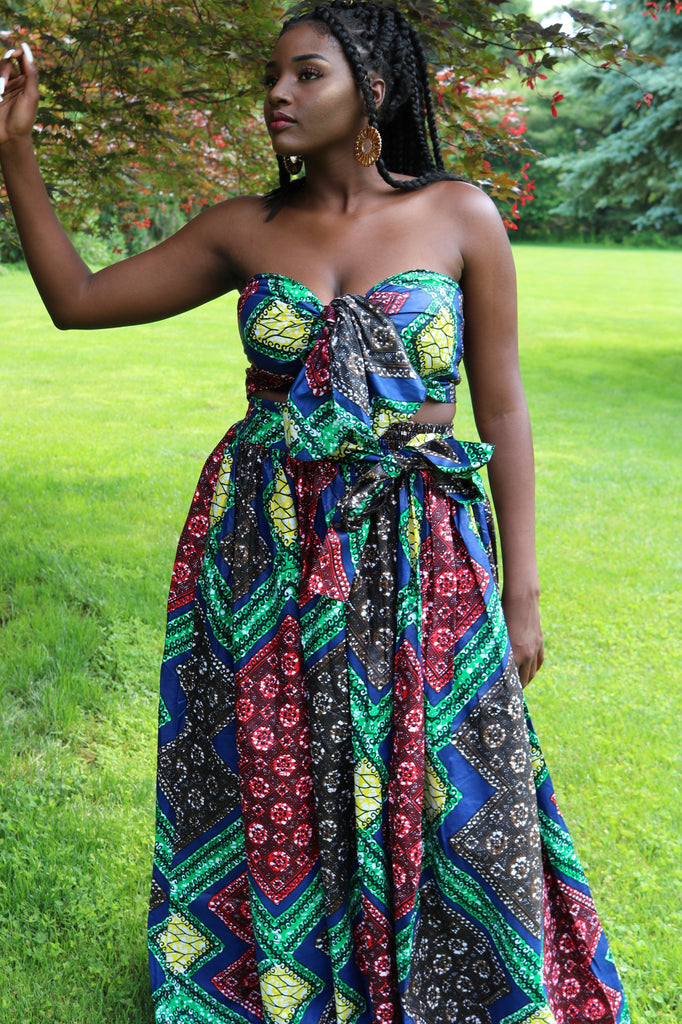 Our traditional African wax print maxi skirts will make you feel like the queen that you are. Every queen deserves to dress like one. This skirt boasts a beautiful bold print, high 3" elasticized full waistband, 2 deep side pockets, attached bow tie belt. Also comes with matching headscarf, that can be used as a top or belt.