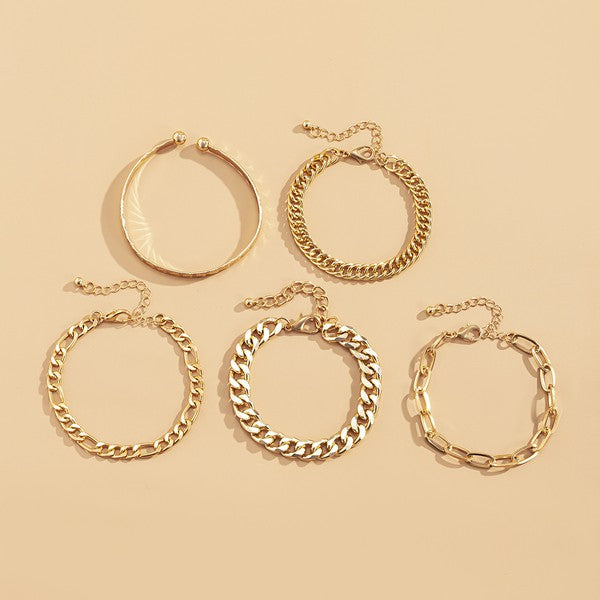 Dazzling 5-piece Gold Stacking Chain Link Bracelet Set, exquisitely gold-plated.