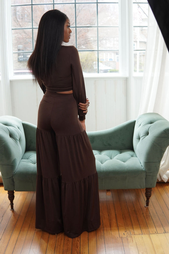 Chocolate Wrap Top and Wide Leg Pant Set