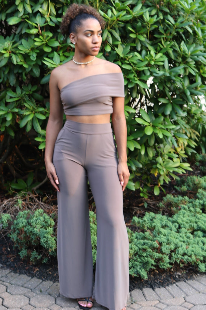 Giving off all the summer sunset feels, this set is simply gorgeous. So effortless, the color is what makes this set a standout. The top has a sexy cropped length, one shoulder sleeves The matching pants have a chic wide leg silhouette and easy pull on style.