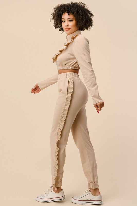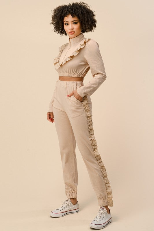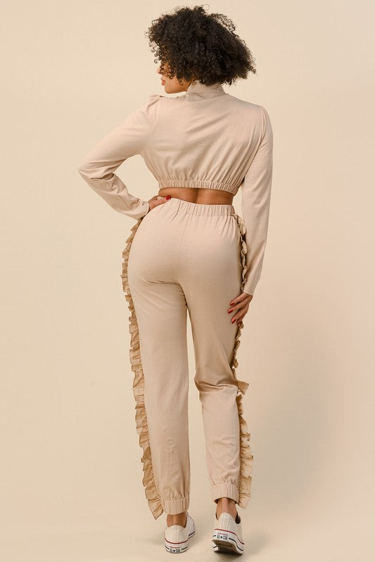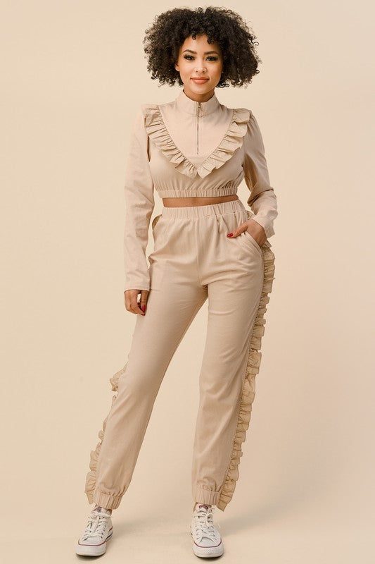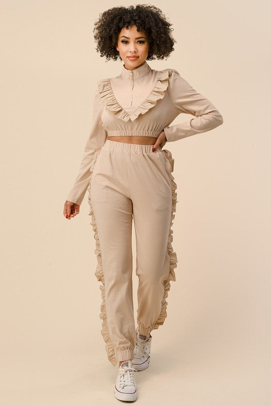 Fun and flirty pant set, featuring ruffle crop top with half zip and ruffle jogger pants.