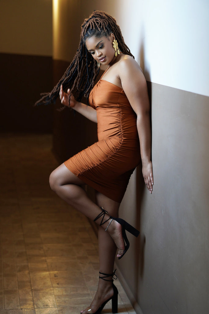 From date night to your next weekend event, our Copper Halter Tie Dress is a must! Achieve an hourglass silhouette in a halter style dress featuring a flirty keyhole with a scrunch ruched detail. Stretchy.