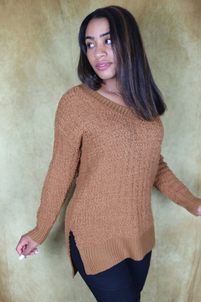 Coffee V-Neck Popcorn Cable Tunic Sweater