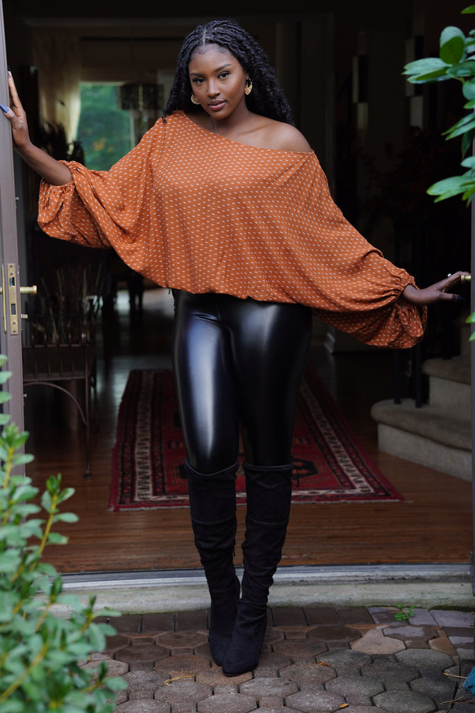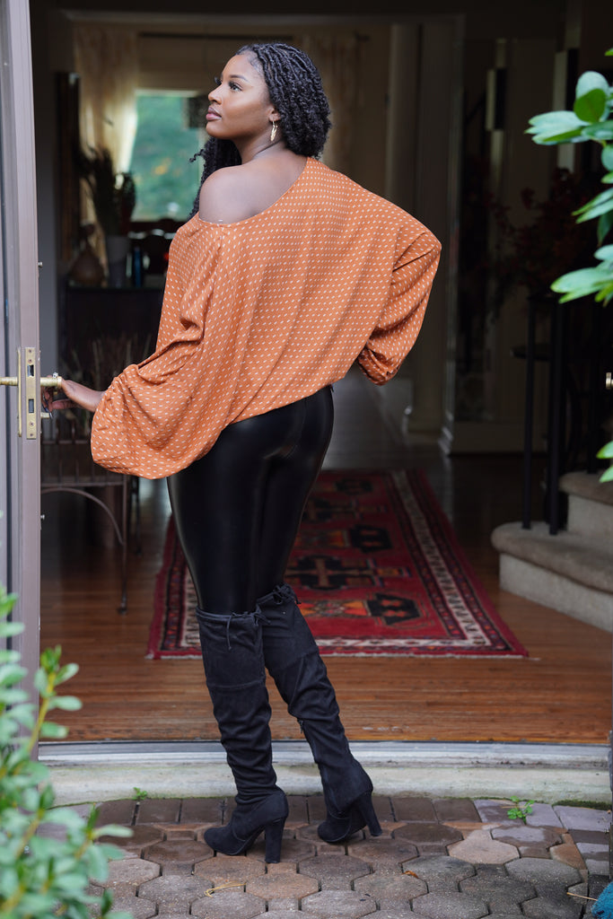 This top is a beautiful rust color with a cream colored small arrow shaped detail. Features gorgeous balloon sleeves. Fits true to size, hangs perfectly to flatter any body style and is lightweight and perfect for fall. Model wearing size 1X.