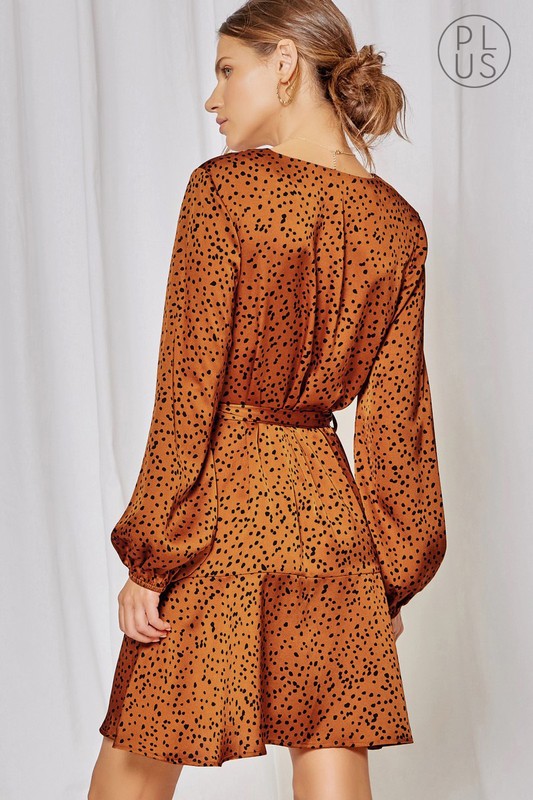 This satin dalmation printed shift dress features v neckline and long sleeves. You can tie the band on the waist for a fit look or leave it out like an A-line dress. Woven, non sheer.