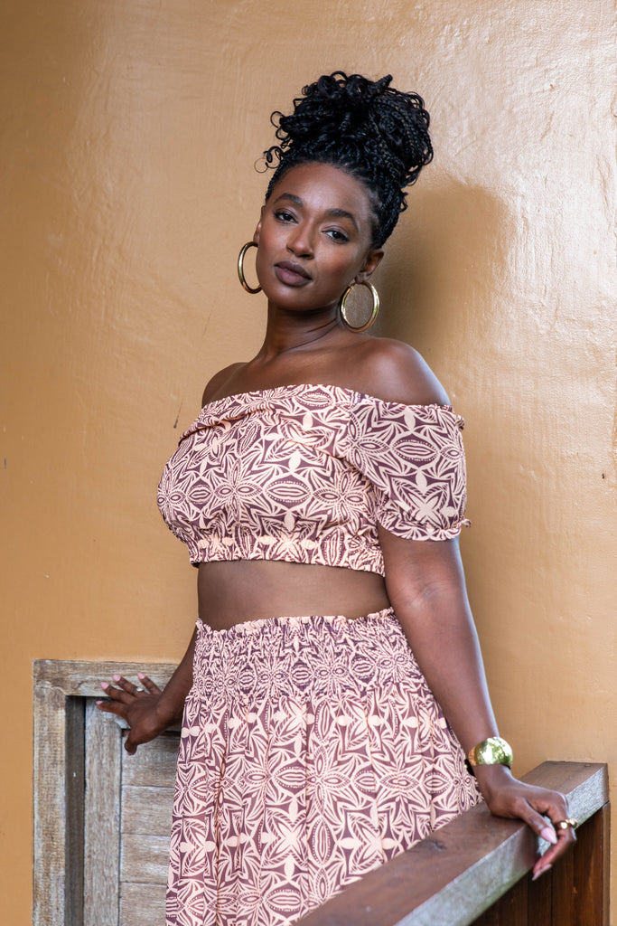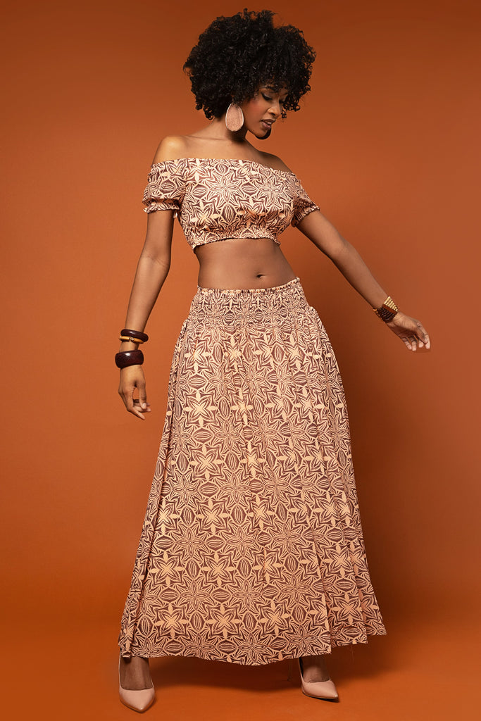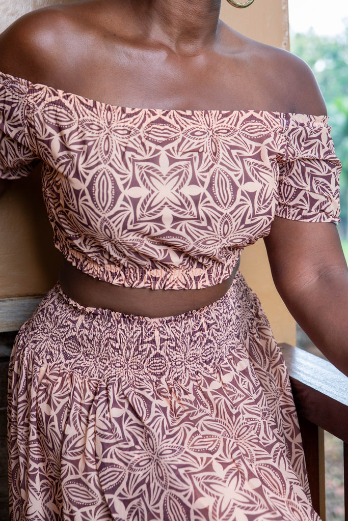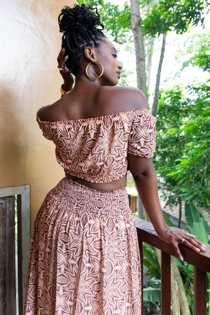 Nina Cheyenne Exclusive Design: The Eva dress is a boho print, in shades of brown and tan, make this dress an eclectic option for any occasion, while a fun two-piece design allows you unlimited options for mixing and matching. Set includes a breezy, smocked waist maxi skirt, with boho print, and a matching off the shoulder smocked crop top.