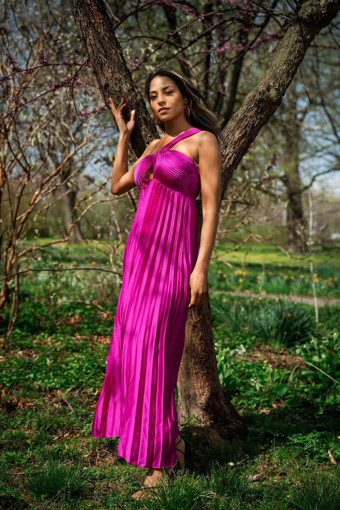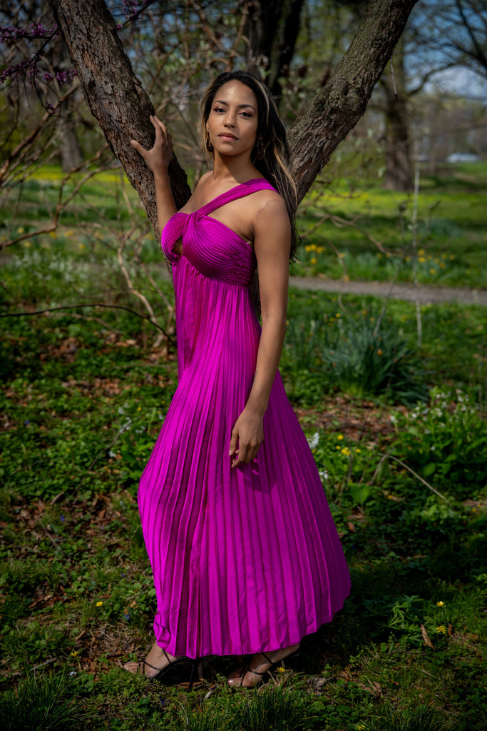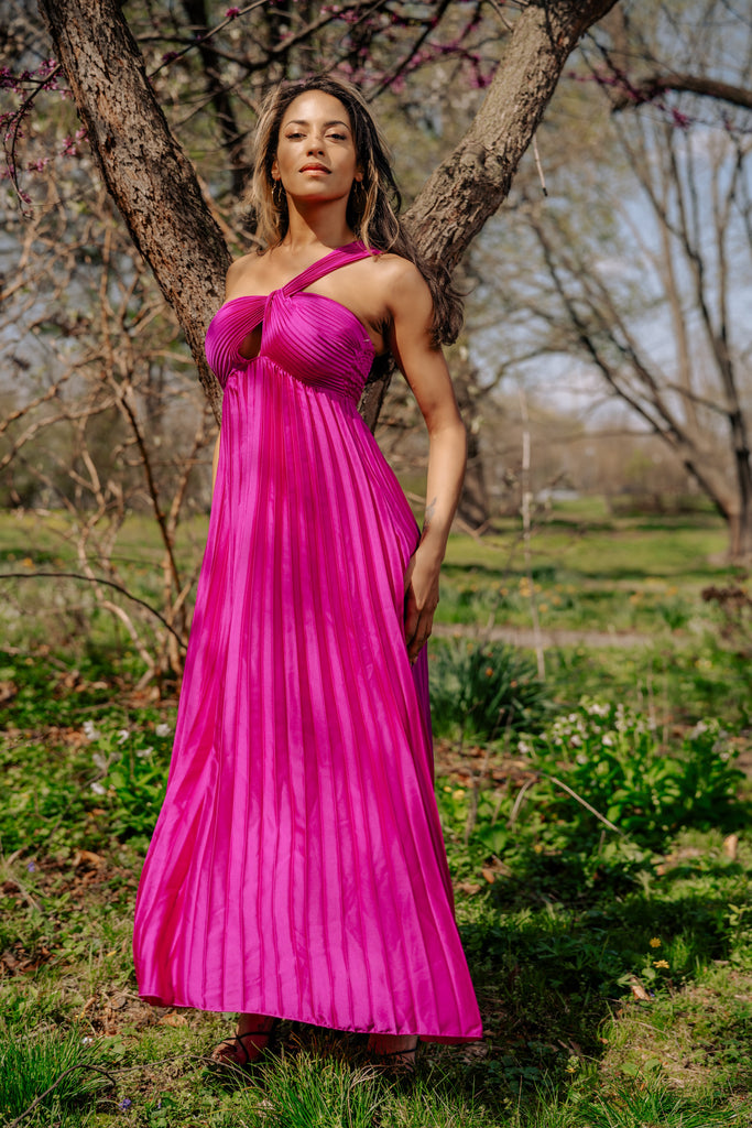 Step into the spotlight with our Fuchsia Goddess Pleated Maxi Dress — a radiant fusion of elegance and effortless glamour. This striking one-shoulder silhouette features a twisted halter neckline with a peekaboo keyhole cutout that enhances your natural shape. Crafted in a lightweight, airy fabric with soft pleating that moves with every step, this dress was made to turn heads.
