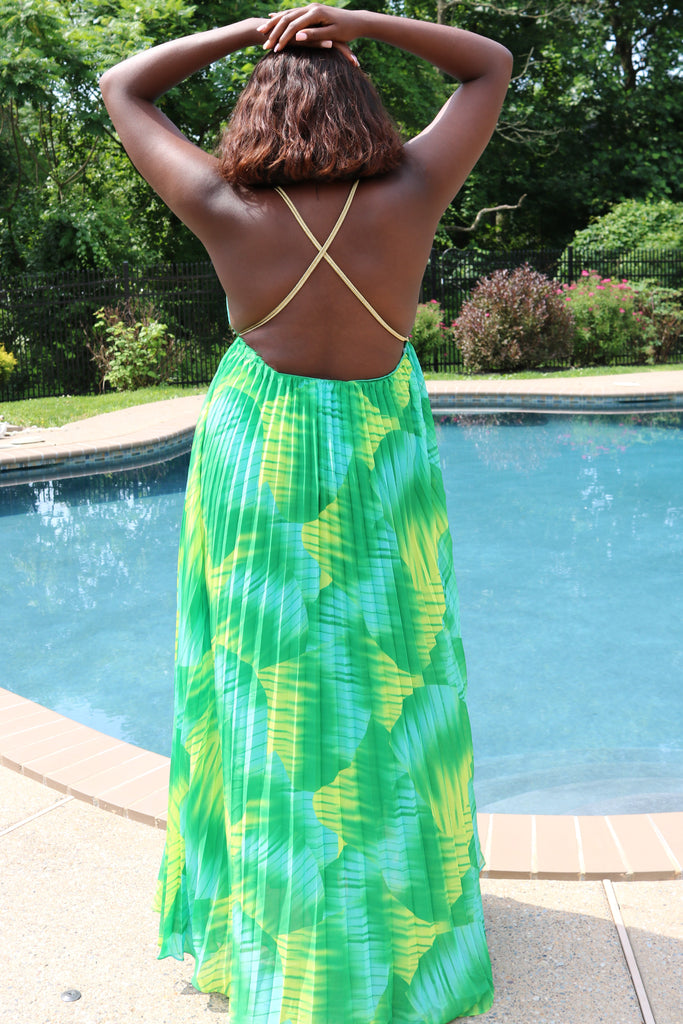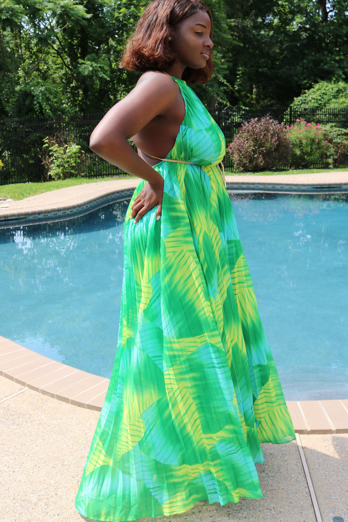 Vacay mode officially begins when you slip into this breezy tropical floral pleated halter maxi dress! A tying halter neckline and open back, pleated print bodice.