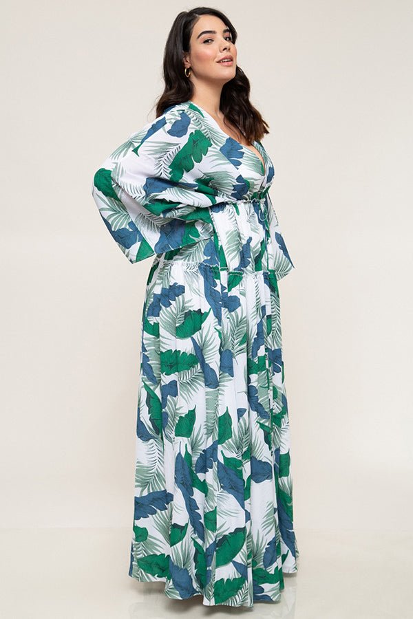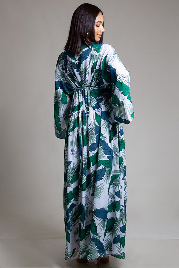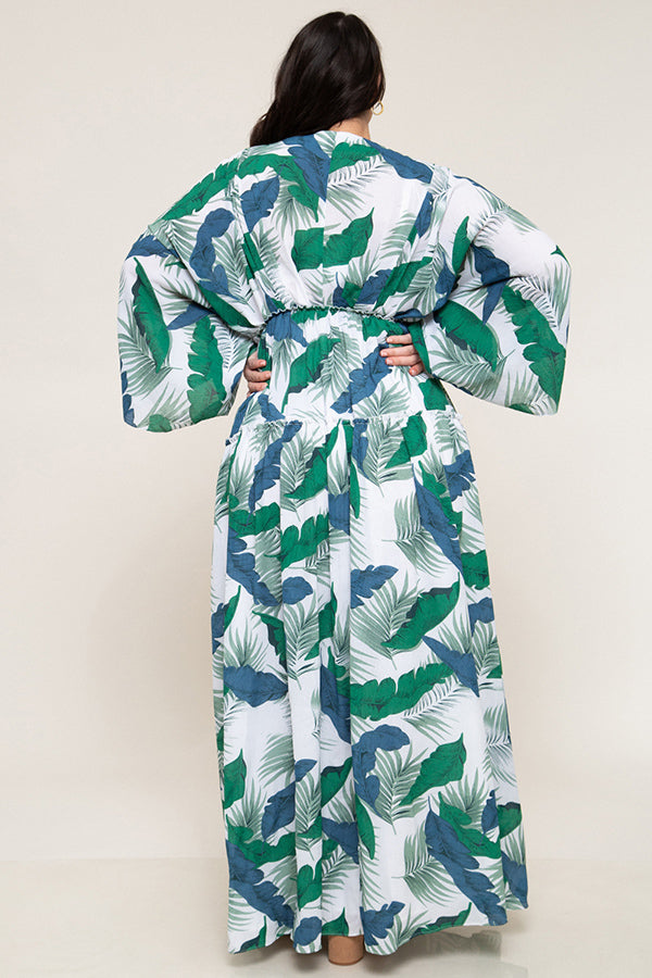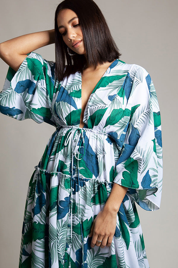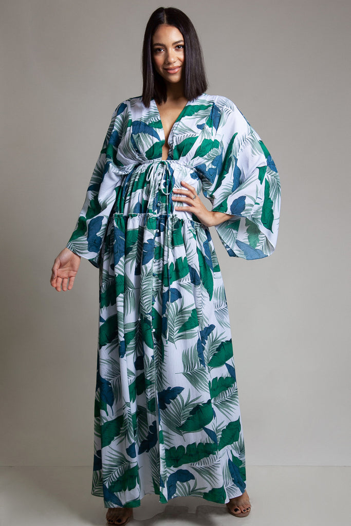 Perfect vaca dress! Tropical leaf print kimono maxi dress featuring a button down front and two-tier flowy skirt.