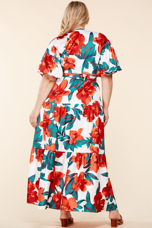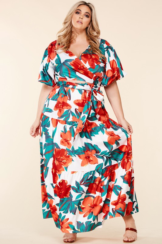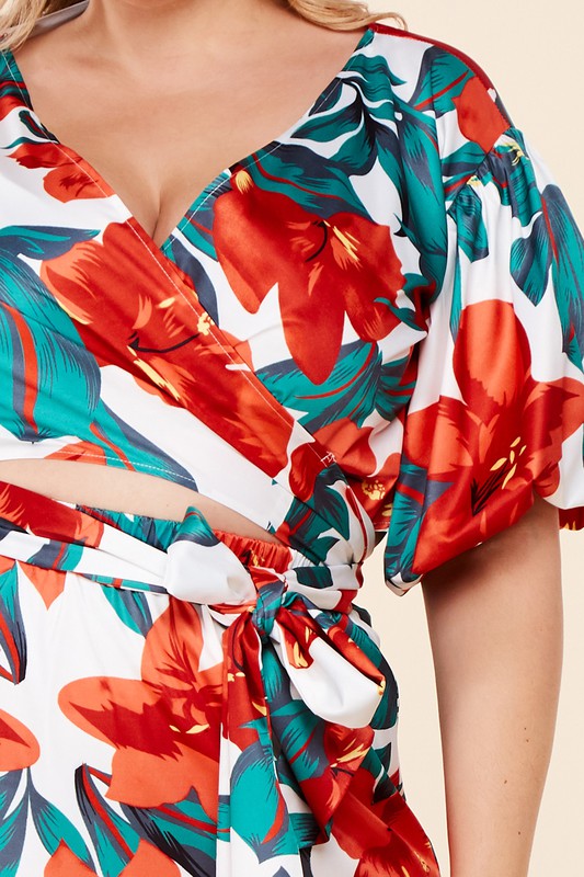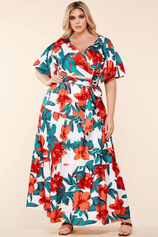 Beautiful orange flower two-piece skirt set, featuring a bubble sleeve crop top with a multi-way wrap front and is paired with tiered maxi skirt. Skirt features an elastic waistband and partial lining.