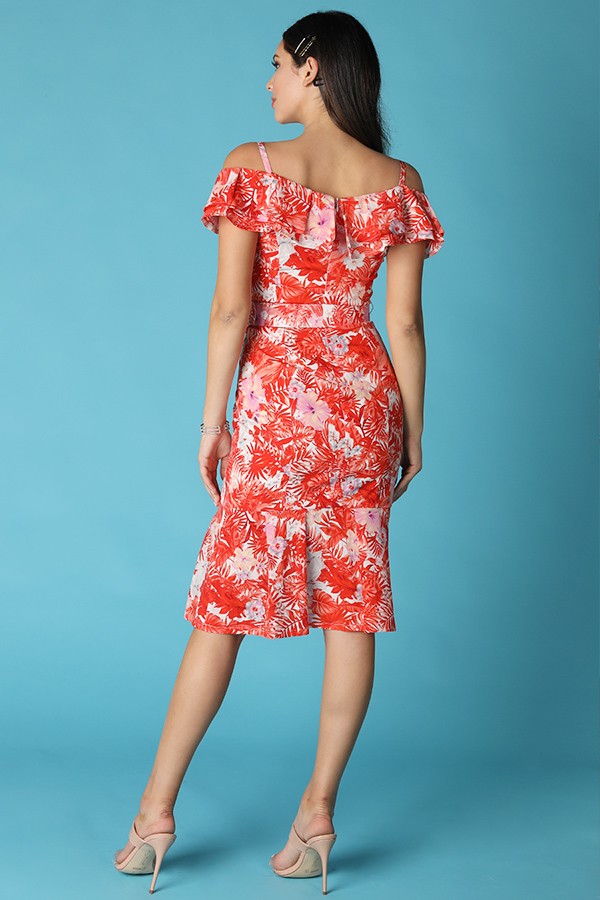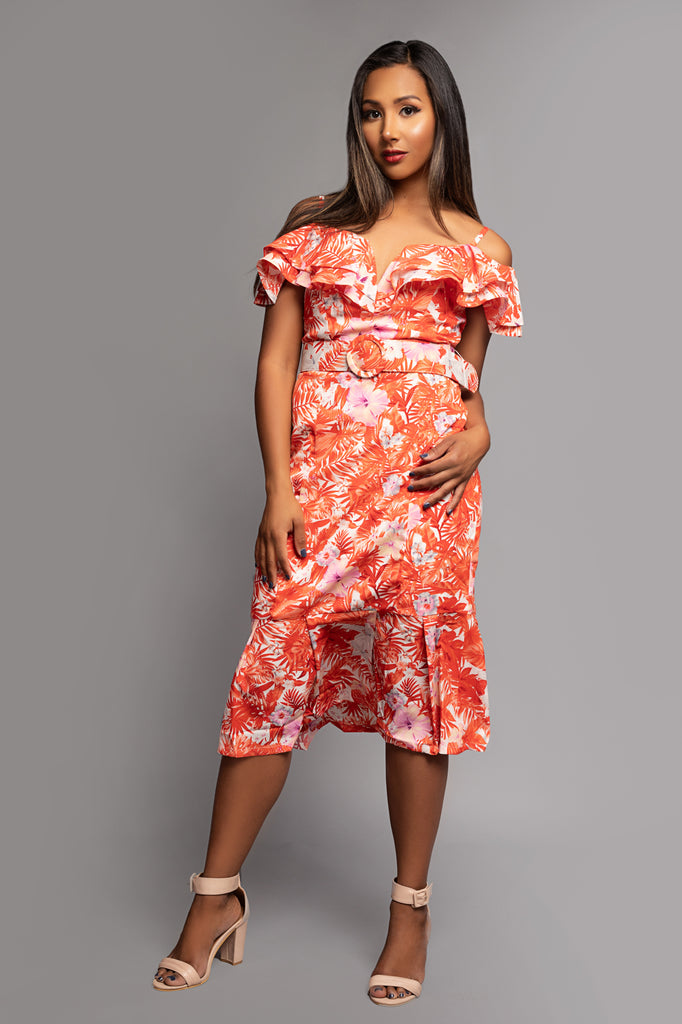 Beautiful ruffled off shoulder tropical print dress, featuring matching belt, ruffle hem and zipper back. Fully Lined.