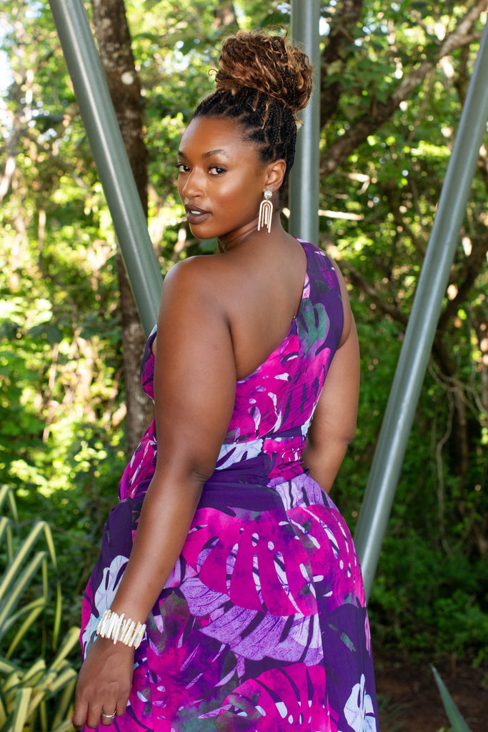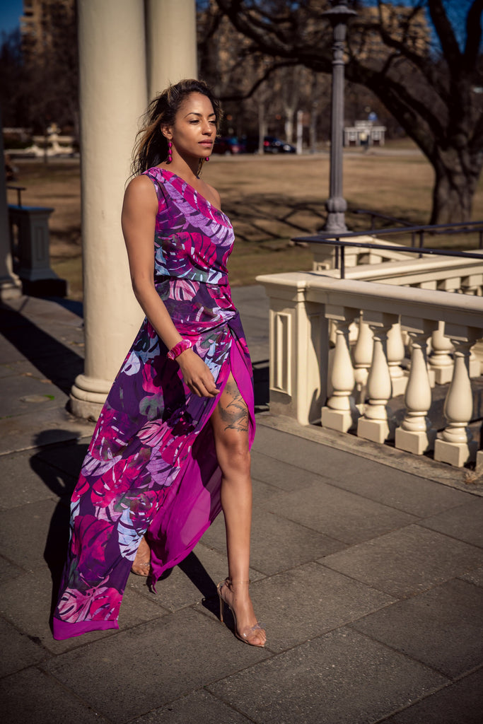 Rachel One Shoulder Purple Palm Print Maxi