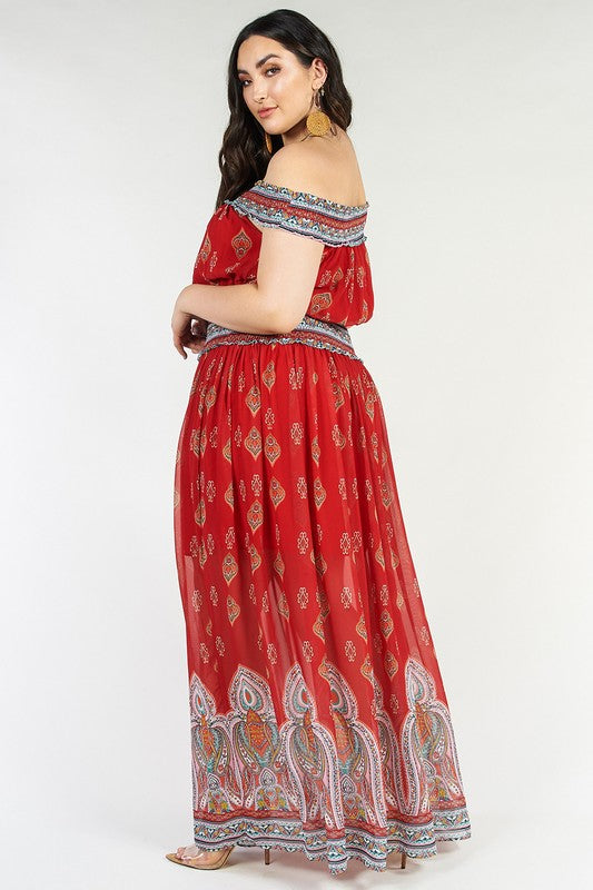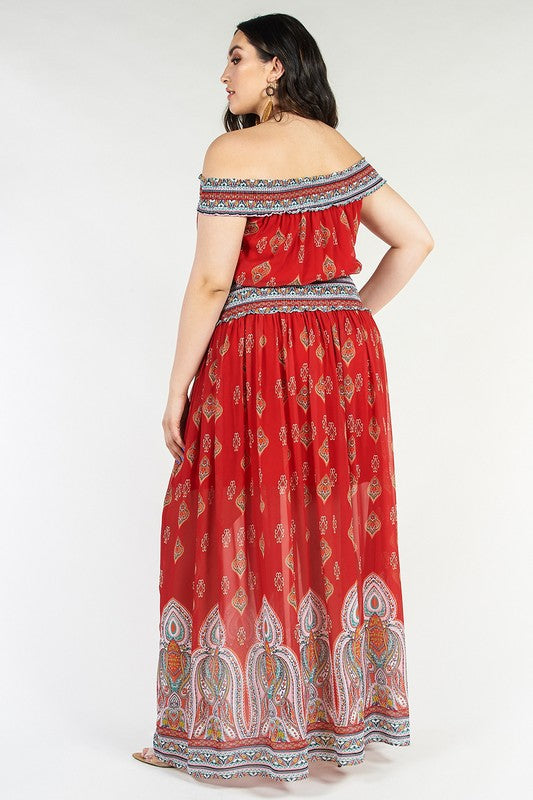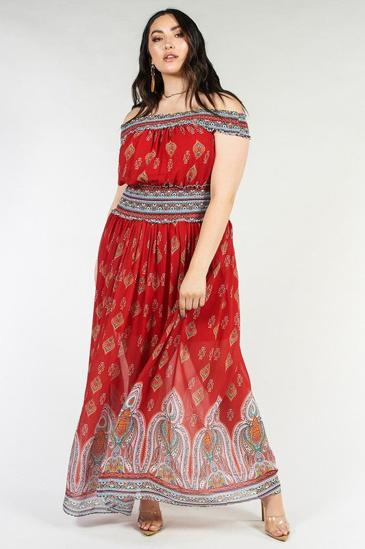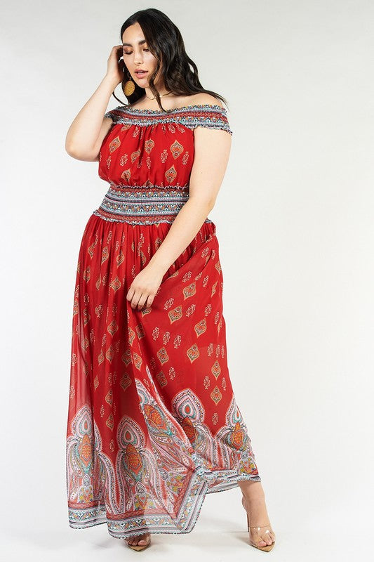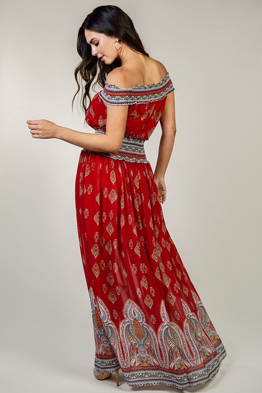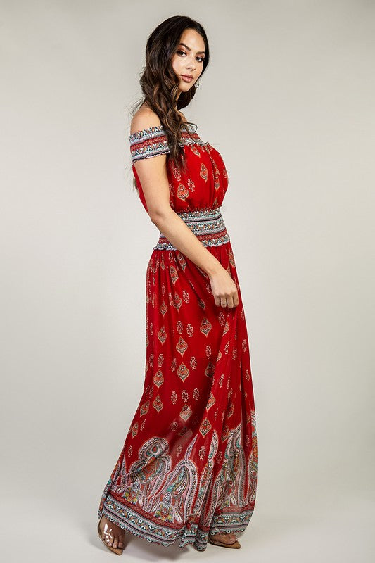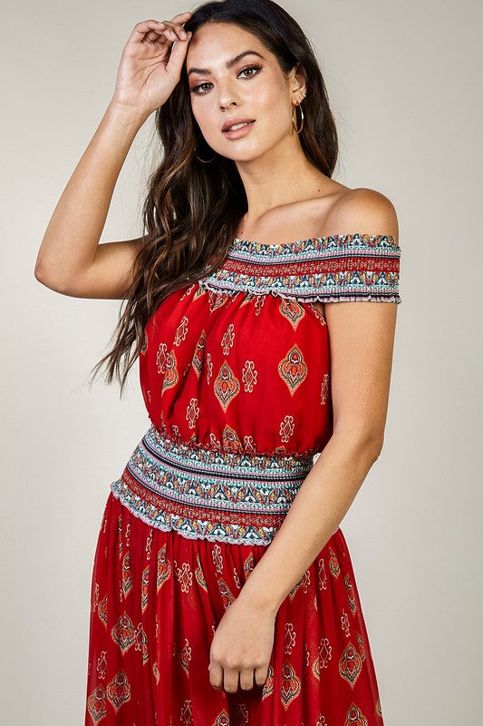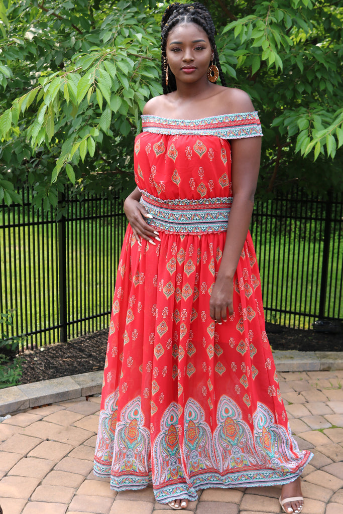 This long and beautiful maxi dress is the perfect bold choice for color in your wardrobe! Beautiful ethnic print off-the-shoulder maxi dress in a scarlet red chiffon fabric features smocked neckline and waist. Paisley border print. Partial lining