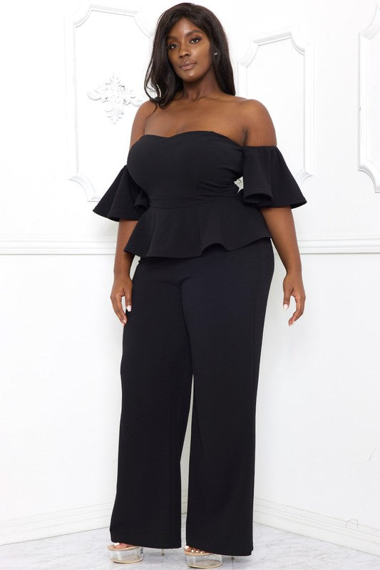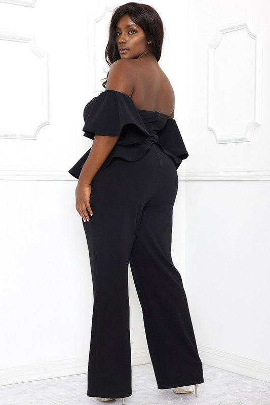 Elevate your style with this chic plus size jumpsuit. The open shoulder peplum design adds a touch of femininity to the look, while the ruffle short sleeves create a flirty and playful vibe. The zipper back makes it easy to slip on and off, while the wide leg and moderate stretch provide a comfortable and flattering fit. Whether you're dressing up for a special occasion or just want to make a statement, this jumpsuit is the perfect choice.