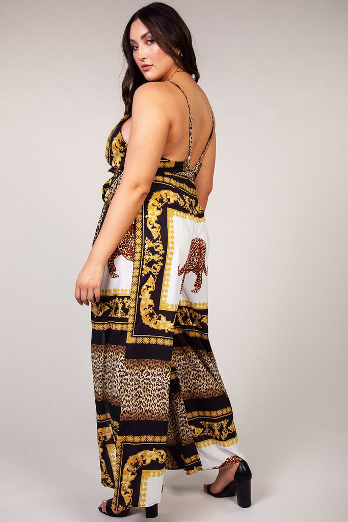 We're loving leopard print this season! This wild cat inspired jumpsuit features a leopard mix animal print with a dual slit front and pleated details. A style you can jump into. This jumpsuit is easy and makes day-to-night outfit effortless.