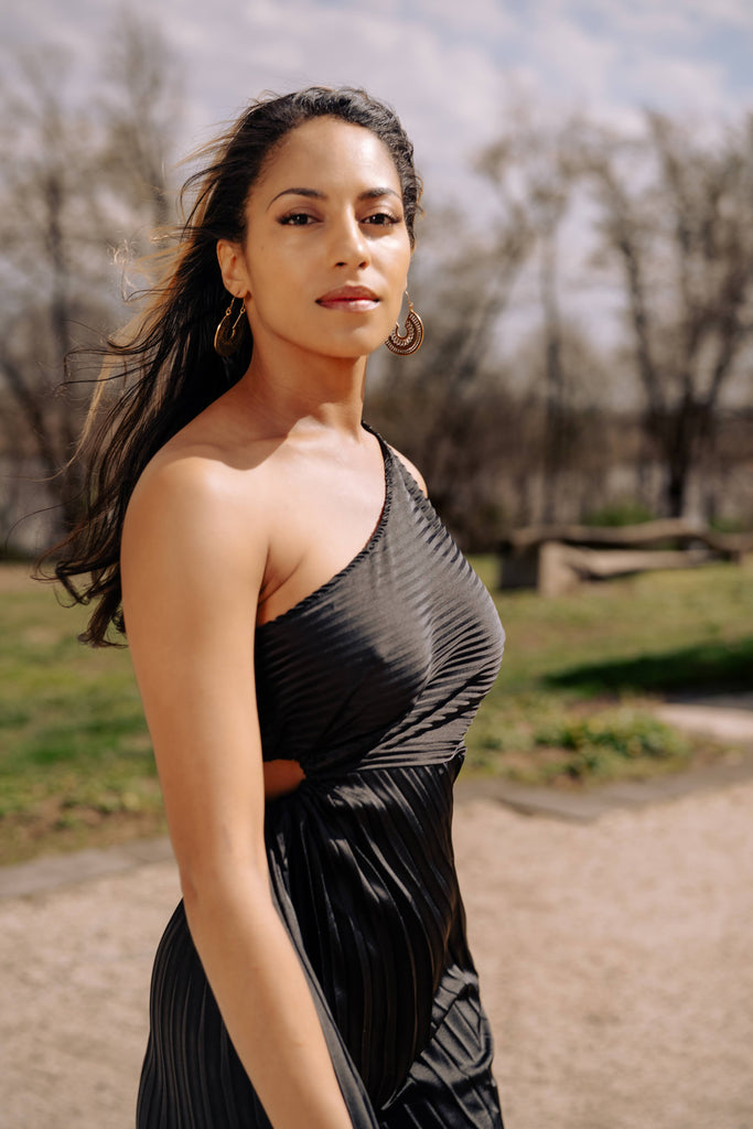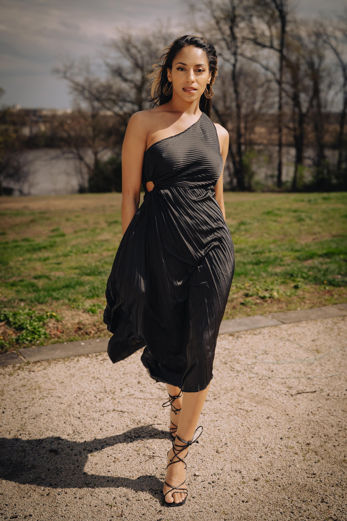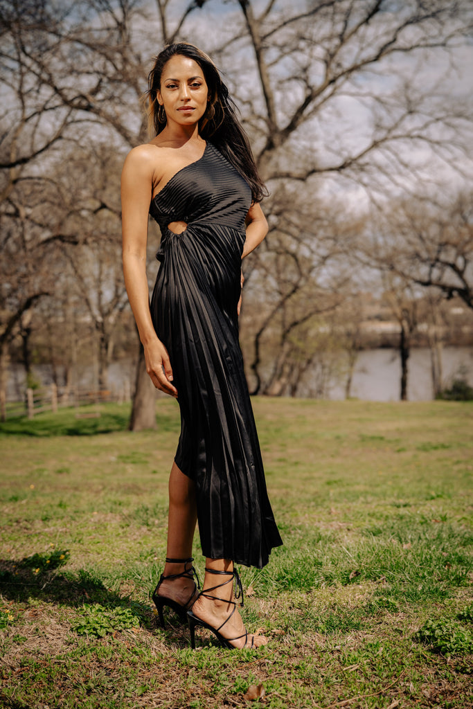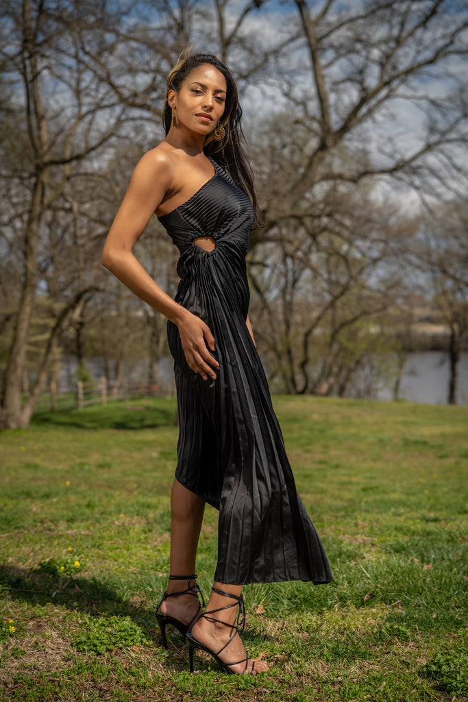 Understated, yet unforgettable. The Noir Eclipse Pleated Midi Dress is crafted from a flowy, lightweight fabric that catches the light with every movement. This asymmetric design features a one-shoulder neckline, a delicate side cutout, and soft pleats that drape gracefully over the body for an effortlessly elegant silhouette.