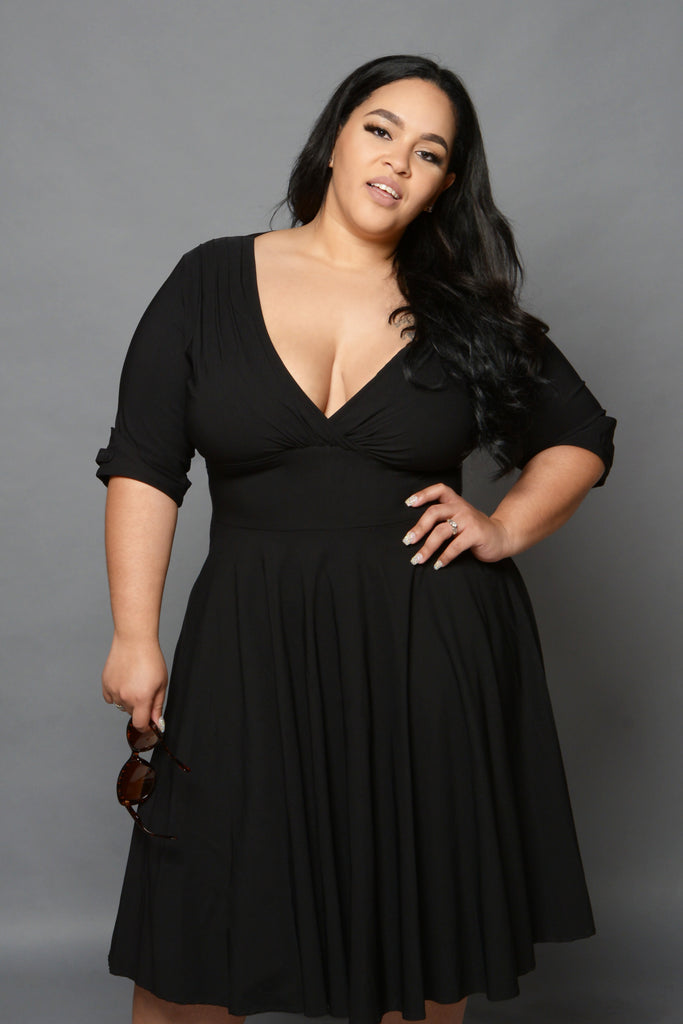 1950s vintage black swing dress from Unique Vintage. Featuring a gathered surplice v-neckline, trim and tailored half sleeves with darling button detail and a thick banded natural waistline that creates a minimized silhouette. An ample A-line swing skirt billows to knee length in soft pleats, zipping slyly up the back. Crafted in a supremely soft stretch blend in stunning retro structure, forming an understated yet flattering design.
