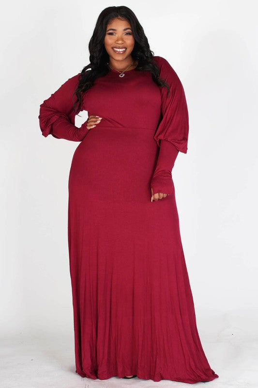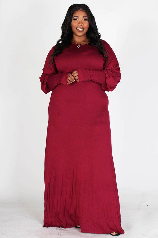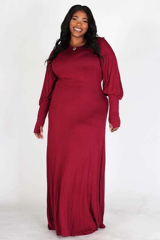 This dress features long loose fit bishop sleeves with a banded cuff, a scoop neckline, a defined waist, and a full skirt with an ankle-length hemline. It's made from a soft, comfortable stretch material and is available in sizes small to 3x.