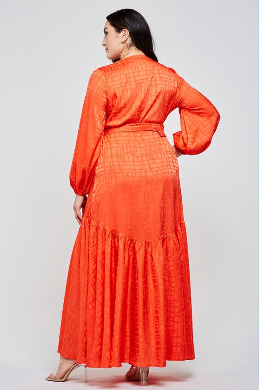 Bright orange dropwaist maxi dress comes in a shiny embossed pattern and features a full button down front, bishop sleeves and tiered skirt detail. And for that figure flaunting look, we added a matching belt with peek of color fuchsia lining and oval buckle.