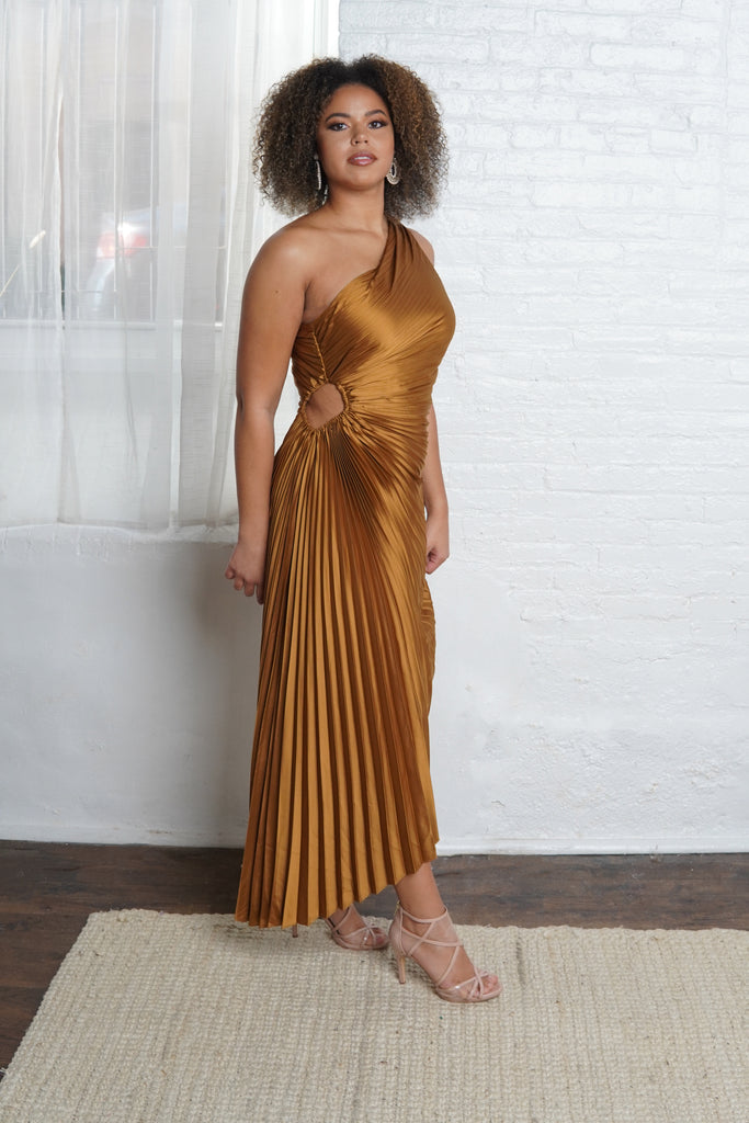 Golden One Shoulder Pleated Dress with Side Keyhole