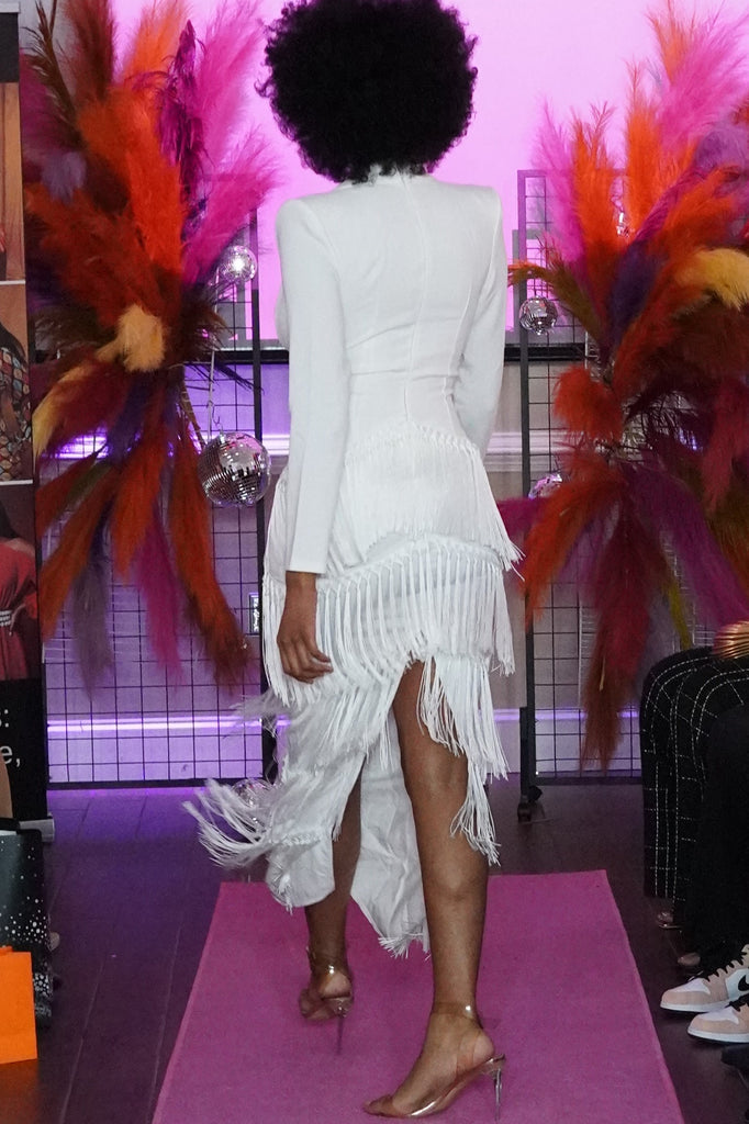 Indulge in luxury with our Multi-Layer Fringe Blazer Maxi Dress. Crafted from a solid stretch woven fabric, this dress features a notched lapel collar and padded shoulders for a sleek and sophisticated silhouette. The front waist cutout detail with mesh panels adds a touch of allure while the multi-tiered tassel-fringe skirt and back leg slit exude elegance. Complete with a zipper back closure for a perfect fit.