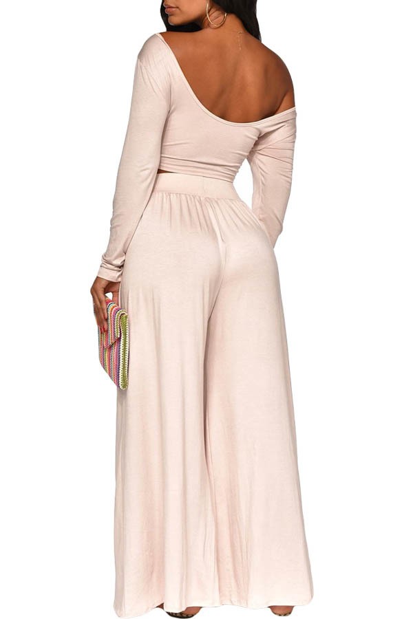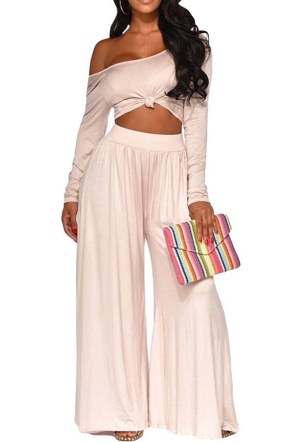 Lounge and style have come together in this effortless 2 piece set. So versatile it can be styled together or separate. Soft crop top is stretchy and features a loose fit, scoop neck, can be worn off the shoulder, Full wide length pants with an elastic waistband, and elastic hem at leg.