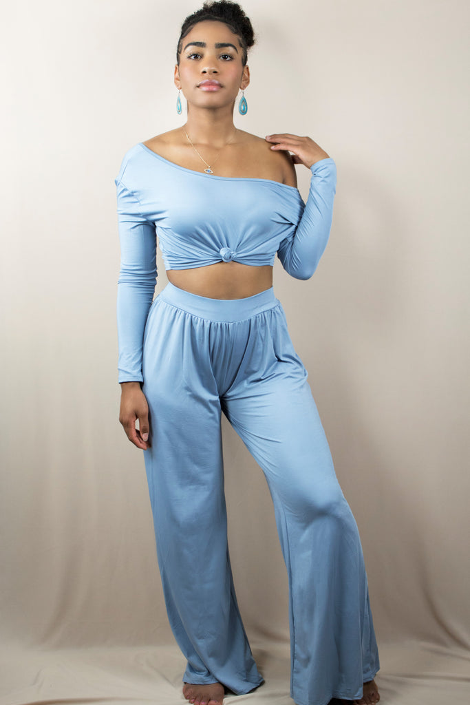 Lounge and style have come together in this effortless 2 piece set. So versatile it can be styled together or separate. Soft crop top is stretchy and features a loose fit, scoop neck, can be worn off the shoulder, Full wide length pants with an elastic waistband, and elastic hem at leg.