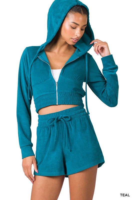 Teal French Terry Cropped Zip Up Hoodie and Drawstring waist short set
