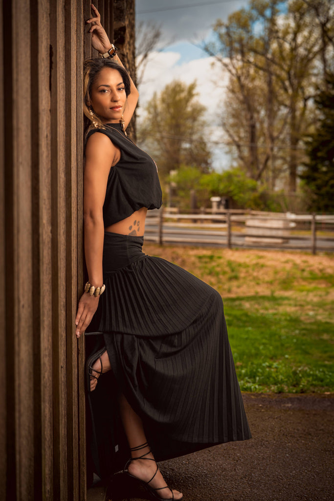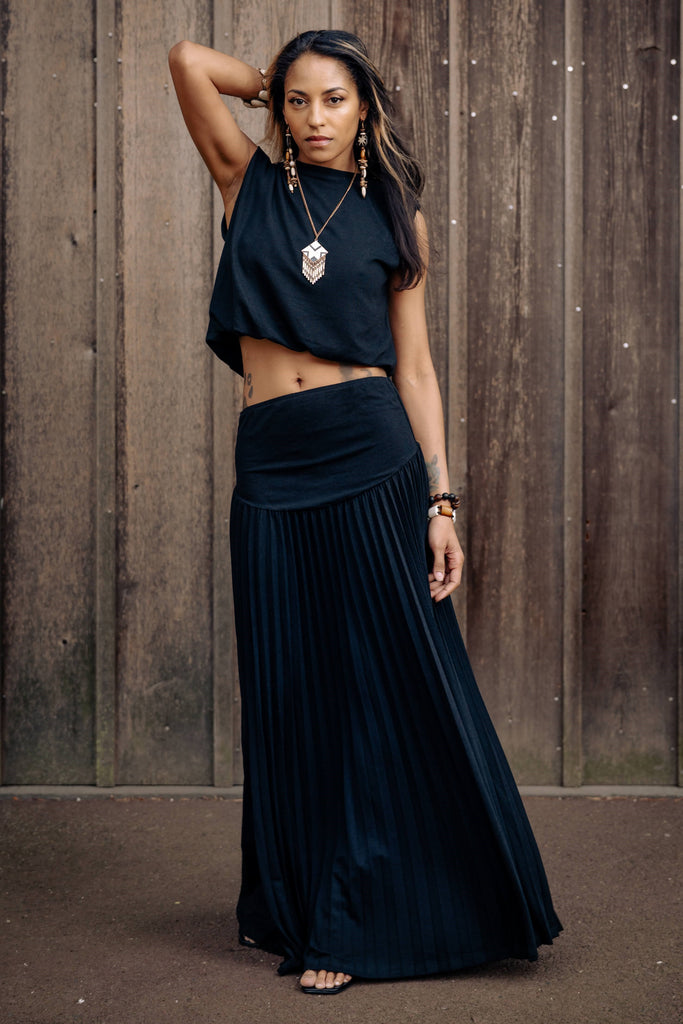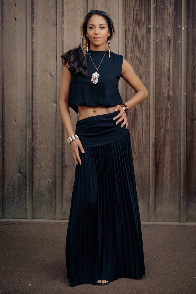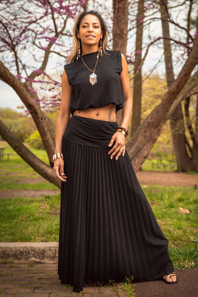 Elevate your effortless elegance with the Onyx Zora Skirt Set—a stunning blend of structure and flow. This two-piece set features a sleeveless cropped top with clean lines and a relaxed drape, paired with a high-waisted pleated maxi skirt that moves with grace. The soft stretch waistband provides comfort without sacrificing style, while the full-length silhouette adds a touch of bohemian drama. Whether you're attending a brunch under blossoming trees or strolling through a summer art fair, this all-black ensemble makes a bold, grounded statement. Complete the look with bold jewelry and strappy sandals for head-turning ease.