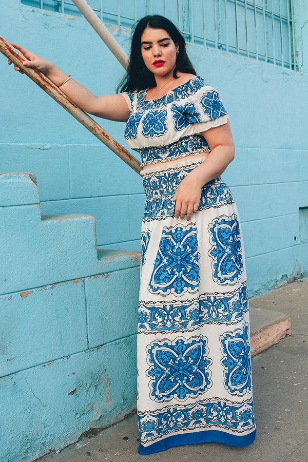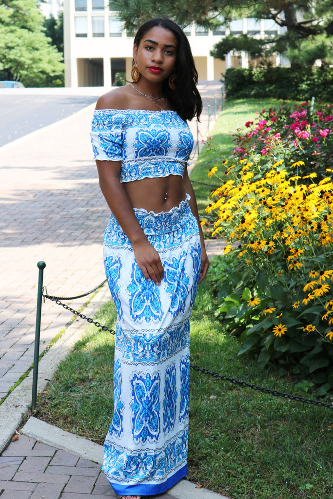 A beautiful vintage tile print, in shades of blue and white, make this dress an elegant option for any occasion, while a fun two-piece design allows you unlimited options for mixing and matching. Set includes a breezy, smocked waist maxi skirt, with border print, and a matching off the shoulder smocked crop top.