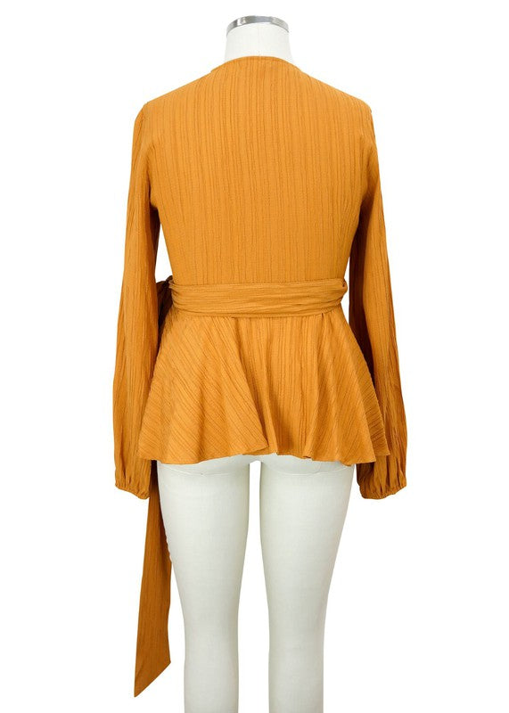This beautiful Tiffany top comes in a deep cider color. Featuring long sleeves, full wrap silhouette, which offers a soft crinkle texture finished with a peplum hem. Update your wardrobe with the perfect statement top for those zoom calls.