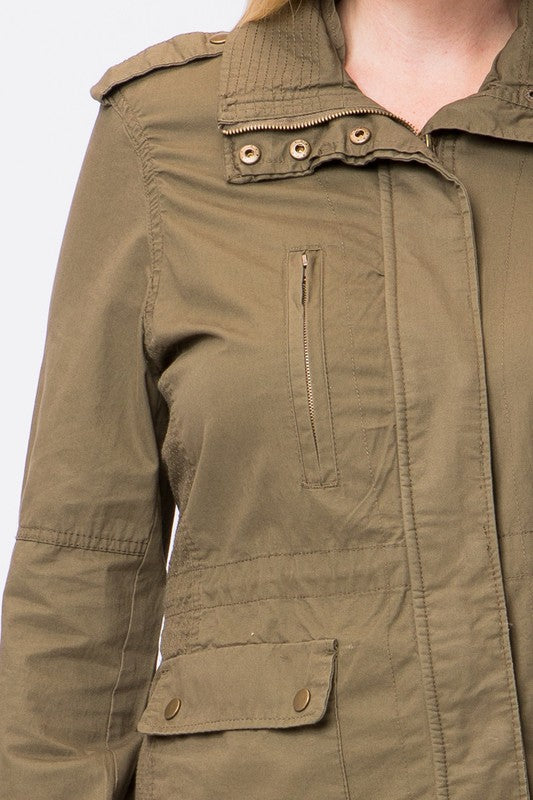 Layer up with this cool twill utility jacket. A must have utility jacket that features a button down and zipper closure, and a thick elastic band.