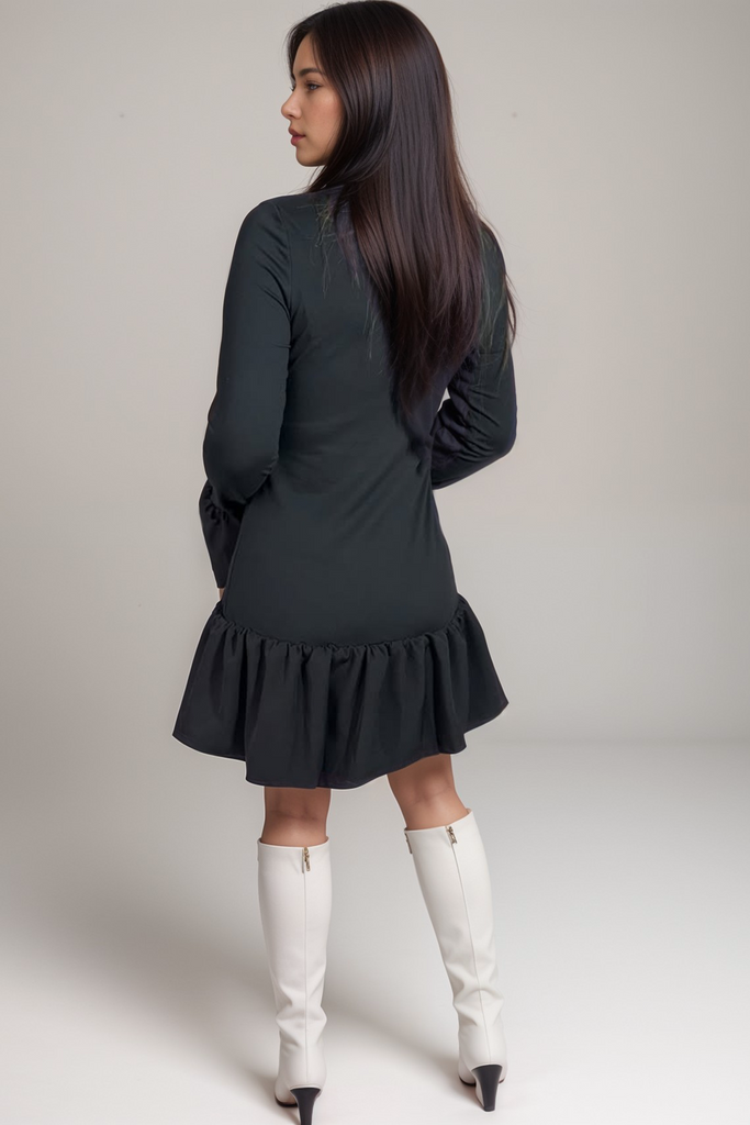 Unleash your inner style icon with this sleek and sophisticated mini dress. Featuring a high neckline, long sleeves, and a playful ruffle hem, this dress is perfect for turning heads day or night. The curve-hugging silhouette adds a touch of elegance, while the soft, stretchy fabric ensures all-day comfort. Pair it with boots for a bold look or heels for a timeless touch of glamour. A must-have for any wardrobe.