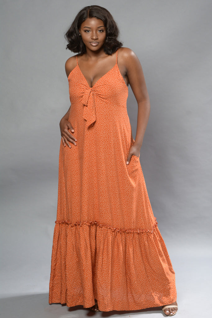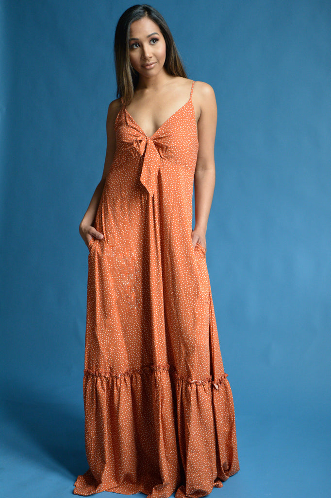 Beautiful burnt orange polka dot print, maxi dress in an oversized fit with a v-neckline, spaghetti straps, bow detail, side pockets, gathered hem, and open back.