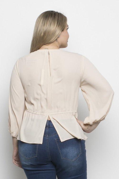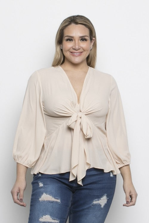 Tie front details take center stage this Season. This flowy cream blouse features a front tie with flare peplum bottom. Perfect for work or dress it up with your favorite bottom for a night out.