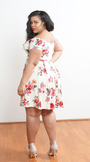 Vintage elegance at it's best. Off the shoulder fit and flare dress with a romantic floral print.