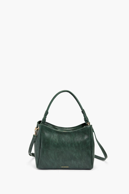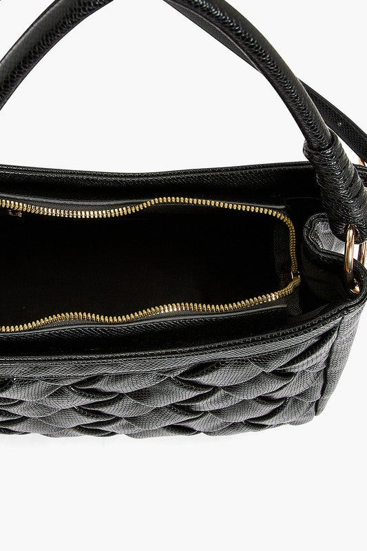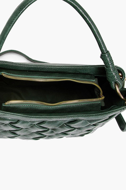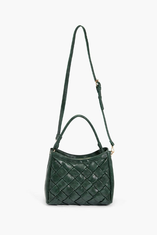 This timeless bag has a beautifully made woven front that is chic and modern, and is paired with a wrapped style shoulder handle. You can always wear it on your shoulder by using the detachable and adjustable matching strap. The premium vegan leather is embossed in a faux snake pattern.