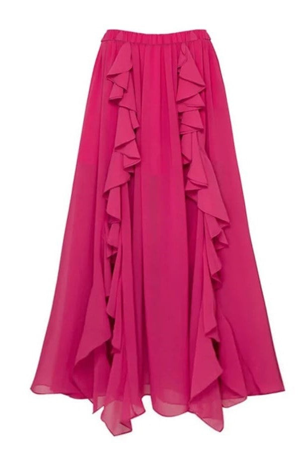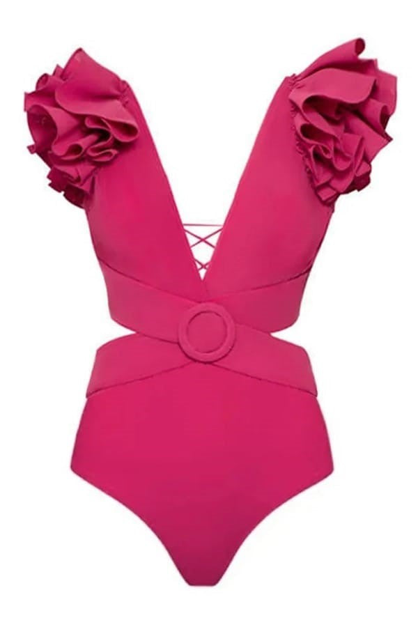 Get ready to turn heads at the beach or pool with this hot pink one-piece swimsuit! Featuring a deep V-neckline, cutout detailing on the sides and back, and high-cut legs, this swimsuit is sure to make you feel confident and sexy. Plus, it comes with a matching ruffle maxi skirt that's perfect for throwing on over your swimsuit when you're ready to hit the town. Made from a stretchy and comfortable material, this swimsuit and skirt set is perfect for any beach day or pool party
