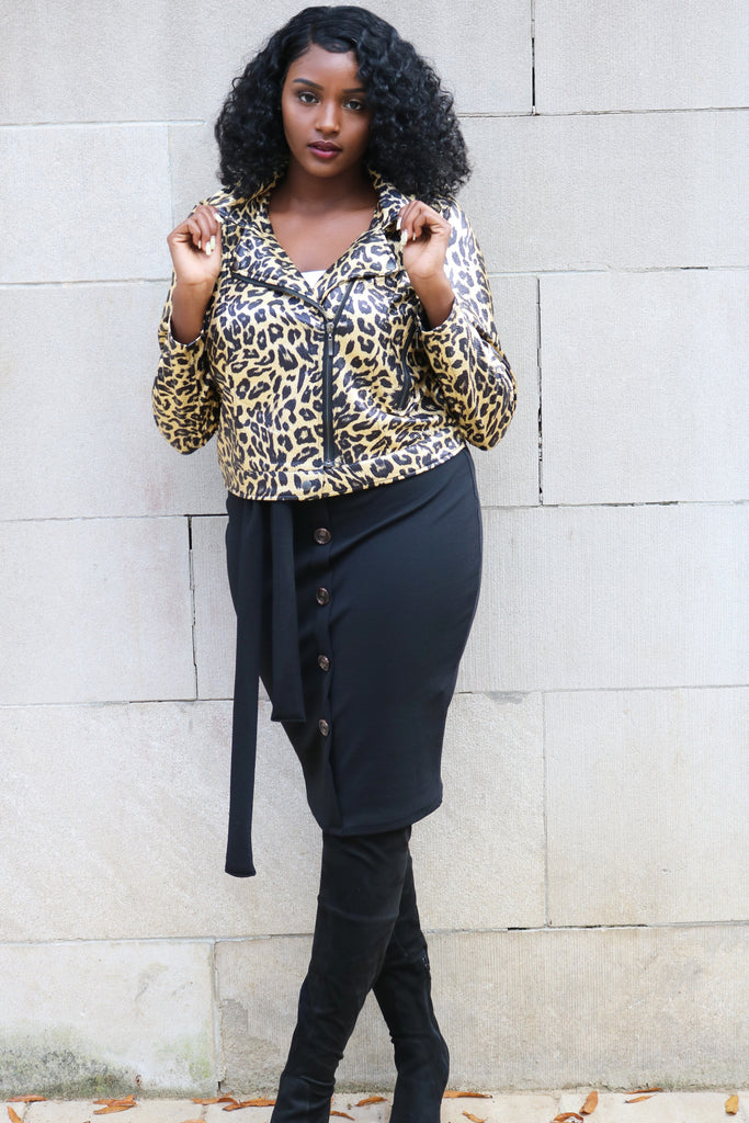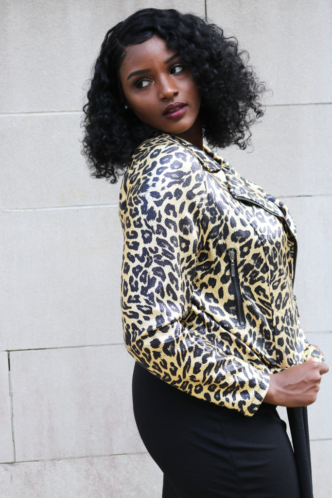 It's your time to slay in this fiercely on trend moto jacket! Featuring a bold gold metallic leopard print, making it the perfect night-on-the-town outerwear piece! Notch lapel. Long sleeves with zip front closure. Stretchy material