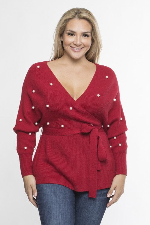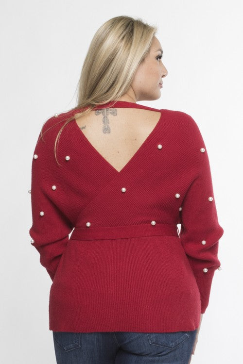 Beautiful pearl embellished surplice sweater, featuring v-neck and matching tie belt.