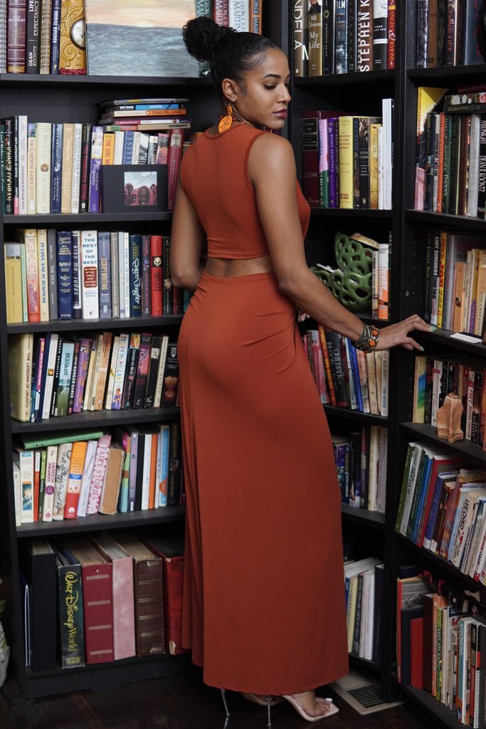 Unveil your inner goddess with the Rust Elegance Cut-Out Gown, a stunning piece designed to make a bold statement. This rust dress features a daring plunge neckline and strategically placed cut-outs that accentuate your natural curves. The high slit adds a touch of allure, allowing you to move with grace and confidence. Made from luxurious, stretchable fabric, this gown ensures a perfect fit while offering comfort and ease of movement. Whether you're attending a glamorous event or an intimate evening, the Rust Elegance Cut-Out Gown promises to turn heads and leave a lasting impression. Embrace your elegance and sophistication with this captivating piece.
