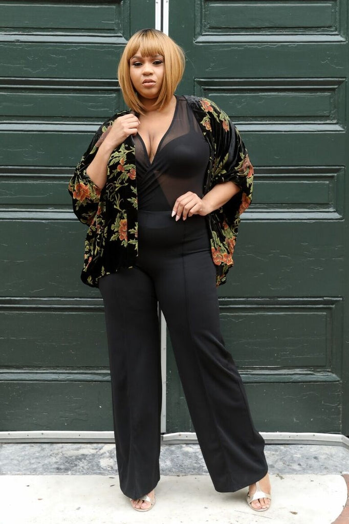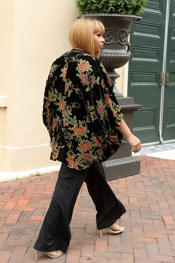 A most graceful layer, this oversized floral print kimono adds day-to-dark drama in burnout velvet. Oversized. 3/4 kimono sleeves. Open front. Tunic length.